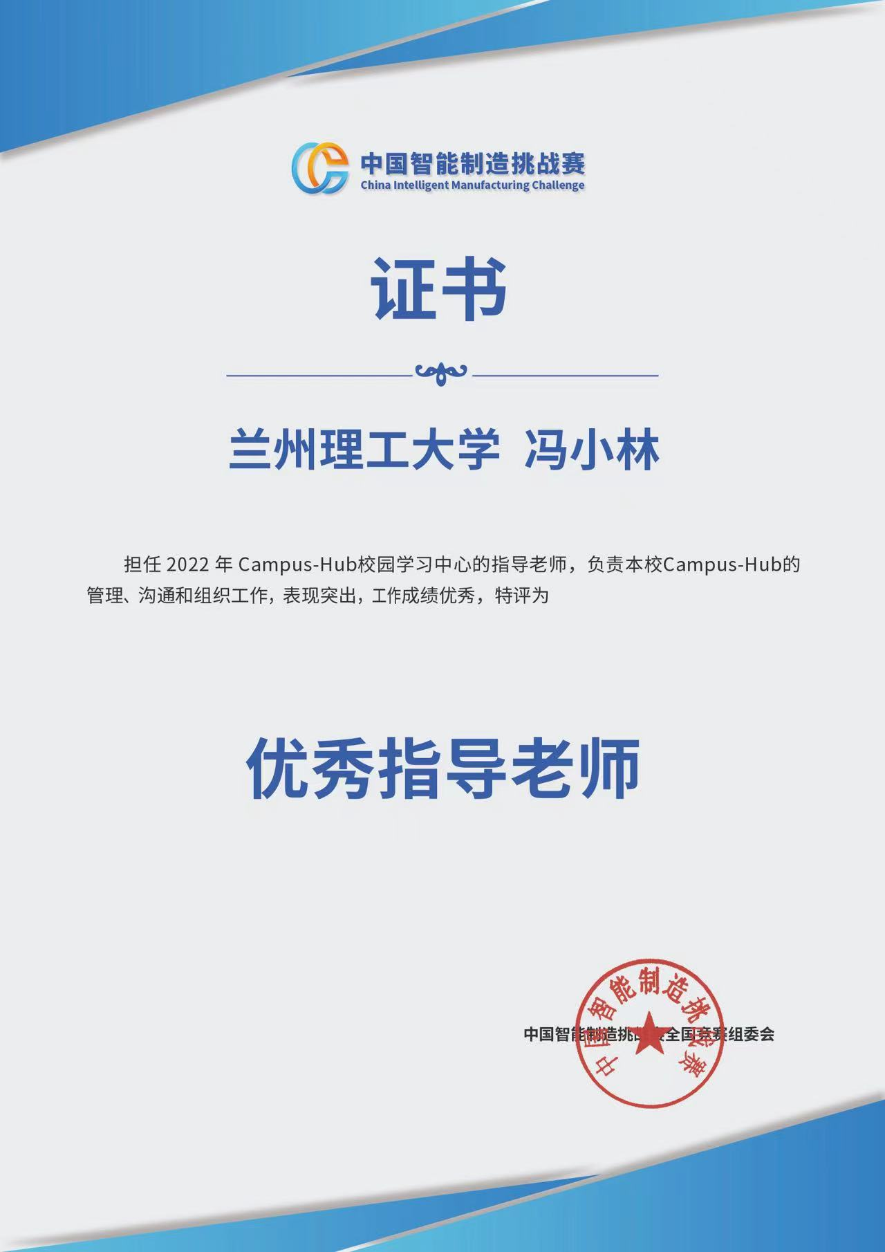 吴雨果同学被授予优秀校园大使(同年为中智赛组委会任用全国8位区域大使之一),冯小林被授予优秀指导教师。此次也是我校Hub在继2016年、2019年、2020年取得该荣誉后又一次获得组委会嘉奖。