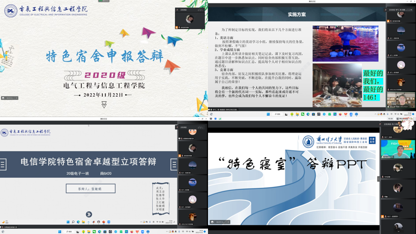 200余名学生代表参加本次活动。此次活动采用线上的方式开展答辩会,寝室立项范围包括学霸型、创新创业型、卓越型宿舍。由参赛宿舍成员进行5分钟的PPT展示,全面呈现出各个宿舍温馨、快乐的真情故事,并提出切实可行的下一步提升方略与实施计划。同学们纷纷表示,今后会继续保持良好的学习生活习惯,坚持积极健康的生活方式,珍惜弥足珍贵的寝室情谊,高度重视寝室安全问题,打造优秀的寝室文化,创建先进文明寝室。