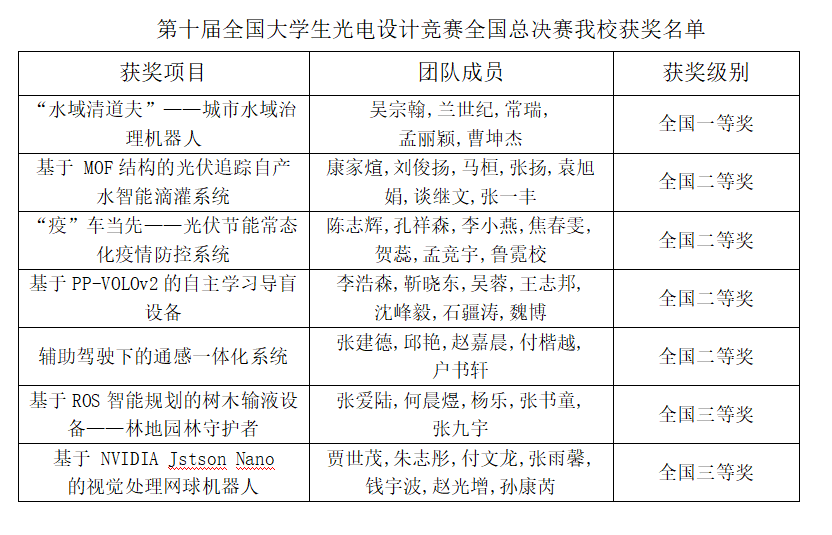 由中国光学学会主办、全国大学生光电设计竞赛委员会具体负责、华中科技大学承办的第十届全国大学生光电设计竞赛决赛于2022年8月25-26日在华中科技大学以线上创新赛的形式圆满落幕。全国共有来自351所高校的2768个项目、17364名师生报名参加本届竞赛。经过前期华北、东北、西北、西南、 中部、东南和东部七个分赛区选拔,最终有来自154所高校的 337个支参赛队、 2538名师生进入全国赛。我校获得国家一等奖1项、二等奖4项、三等奖2项的好成绩,并被评为优秀组织单位。