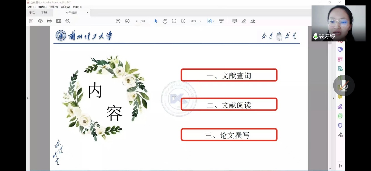 研一、研二以及拟录取的2022级研究生作“学业帮扶”报告。百余名研究生齐聚线上,积极参与。会议中,裴婷婷教师首先就中英文期刊论文、硕博士毕业论文及专利等查询方法为同学们做了简单地介绍;其次将文献阅读的步骤和方法为大家做了归纳总结;然后基于期刊论文每一部分的撰写技巧,为同学们做了详细地讲解。报告结束后,在交流互动环节,同学们踊跃发言,积极探讨。裴婷婷教师就同学们提出的寻找研究方向方法、英文论文撰写技巧及期刊论文发表过程等相关问题,结合自身经验对其进行了逐一详细地解答。学生们也纷纷表示,通过本次视频会议,大家对文献查询、阅读及论文撰写方法有了更加深入的了解,也希望无码影片
