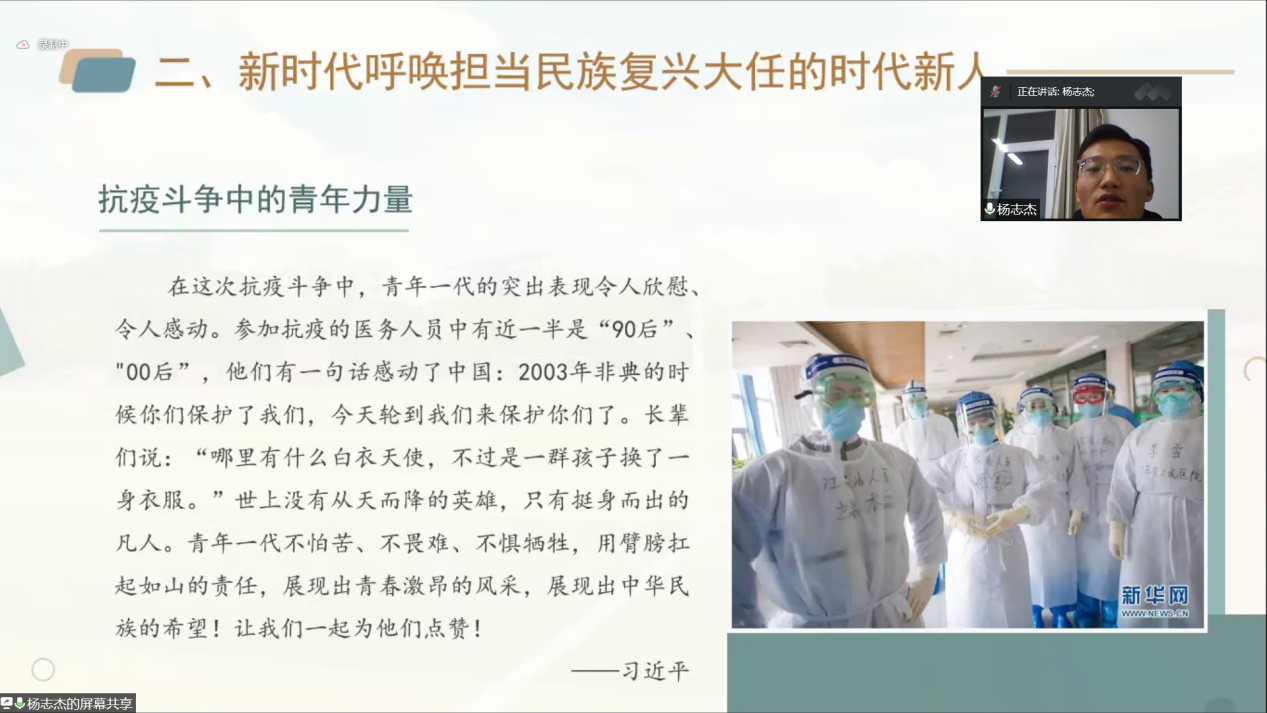 杨志杰老师在培训中从“我们处在中国特色社会主义新时代”、“新时代呼唤担当民族复兴大任的时代新人”、“如何成为担当民族复兴大任的时代新人”三方面展开讲述。他在讲述中回顾百年党史,照亮初心使命;展望今朝鼓励同学们争做有理想、有本领、有担当的时代新人。在培训中,他引用总书记的话鼓励大家“新时代的大学生朝气蓬勃、好学上进、视野宽广、开放自信,是可爱、可信、可为的一代”。新时代大学生既是民族复兴伟大进程的见证者和参与者,也是社会主义事业的生力军。当前大学生建功立业的舞台是空前广阔的,他勉励新时代青年为实现第二个百年奋斗目标努力奋斗,在新时代中有所作为。