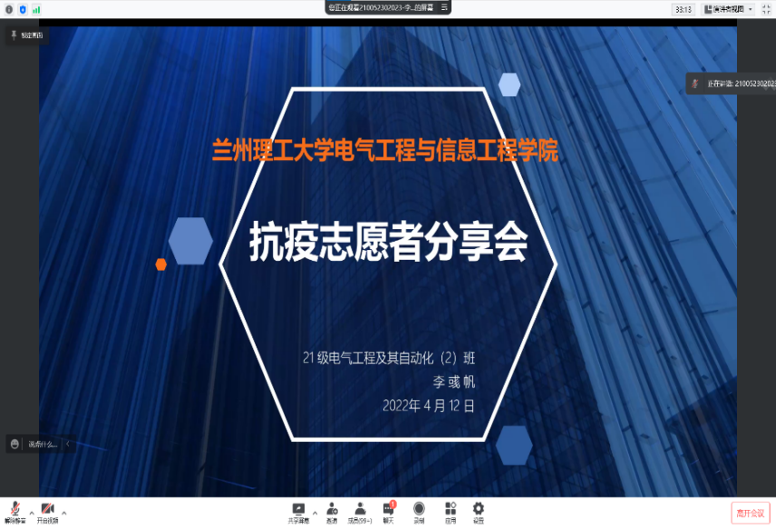 本次“我身边的抗疫人”主题分享会,分为两个板块,一是学生志愿者的经历,二是同学们家人的抗疫故事。2019级张晓栋结合去年10月份兰州疫情的抗疫经历进行了分享,他讲到“面对突如其来的疫情,我选择加入到抗疫的志愿服务者队伍,作为一名青年学生,我们要有担当,有使命感,给予身边同学最大的信心与安心,互相鼓励,团结一心。”2020级李世杰讲述了自己哥哥的抗疫故事,“在天水爆发疫情后,哥哥就加入了志愿者队伍,他每天的主要工作是分配并发放早、中、晚三餐,以及派送小区居民的生活必需品。为了确保大家的安全,在取到物资之后,只能是放到各个居民的门口,实现零接触配送。为了保证核酸检测不落下一个人,还需要在每层楼做完核酸之后提示扫描相应登记的二维码。涉及到整个居民楼住户安全的问题,他们绝不马虎,涉及到通知各个住户信息的时候,也绝不含糊。”