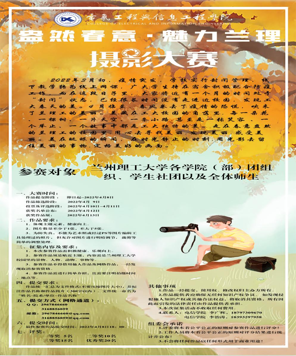 主办,面向全校师生开展,分为教师组和学生组两个赛道,且活动形式新颖,持续时间较长,从4月3日—4月8日为作品征集时间,各位参赛选手可以走在春意盎然的校园里,用心去寻找工大春天的美丽,且参赛作品题材不限但需积极健康、乐观向上,贴近主题,同时本次大赛共设置一等奖5名,二等奖10名,三等奖15名,优秀奖20名,获奖名额多且奖品丰厚。