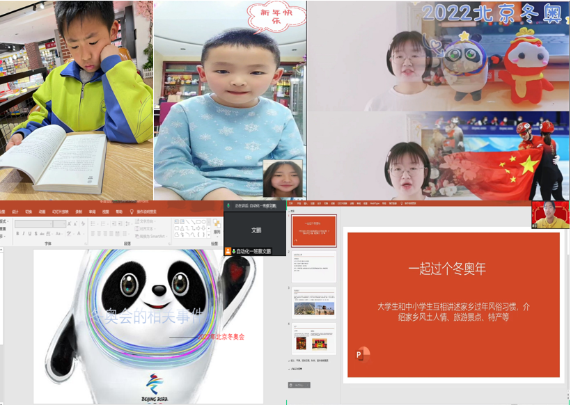 组织了“一起云支教 共同迎冬奥”寒假社会实践活动,旨在深入学习贯彻习近平总书记关于北京冬奥会各项工作的重要指示,进一步弘扬奥运精神、推广冰雪运动、宣传冬奥文化,展现新时代青年风貌,用实际行动为北京冬奥会加油助威。本次活动共有40余位优秀学生志愿者参与此次活动,携手完成“一起云运动”“一起看冬奥”“一起云阅读”“一起过个冬奥年”四部分活动内容。
