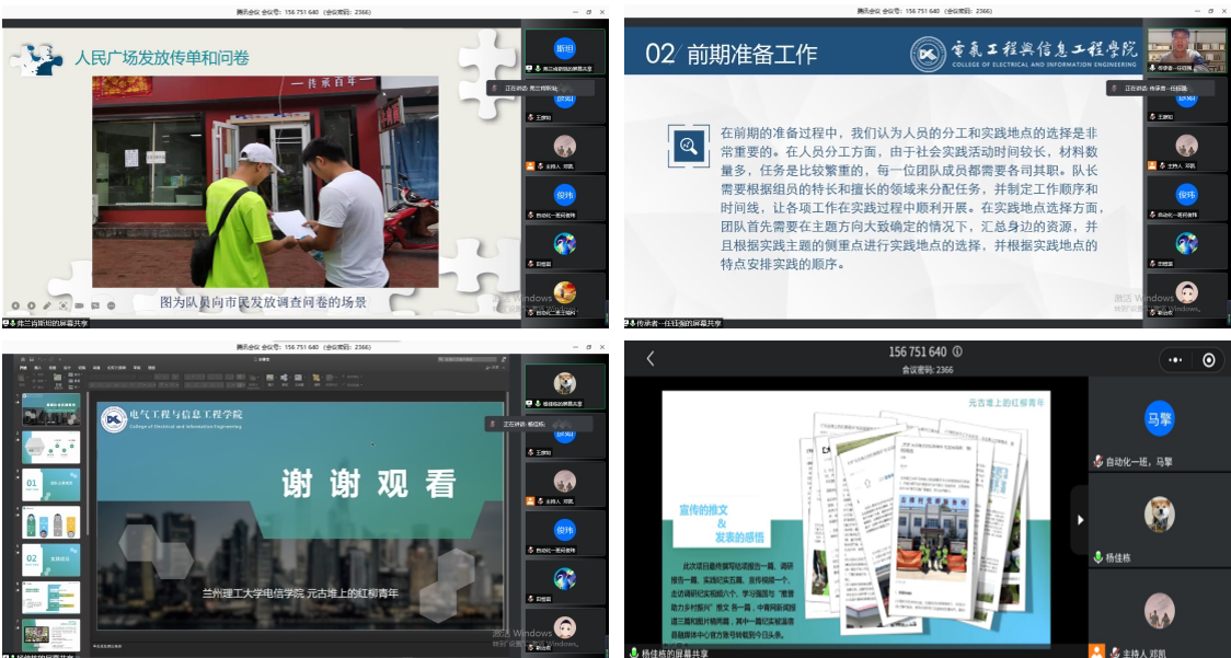 各团队代表成员依次对本团队暑期三下乡社会实践成果进行展示,讲述社会实践的感想和实践过程中的收获。杨家栋同学及他的团队在暑期赴元古堆村开展“科技赋能 乡村振兴”实践项目,通过讲述脱贫攻坚记忆,观察振兴历史成就;调研走访,寻找乡村振兴新变化;科教关爱,引导新生代蓬勃发展;科技赋能,助力特色产业新发展等环节用大学生自己的方式助力乡村振兴。王金鹏同学及他的团队深入甘肃省白银市景泰县,对当地的学校、禁毒机构、村庄、疾控中心等地区进行深入了解调查,弘扬青年服务人民群众的奉献精神,切实提高当地群众对毒品、艾滋病危害的认识和自主防范能力。陈珊珊同学及他的团队重走解放兰州战役路程,前往沈家岭战役遗址进行采风,了解红色文化,传承红色精神。靳治政同学及他的团队前往甘肃会宁重走红色足迹、追溯红色记忆。