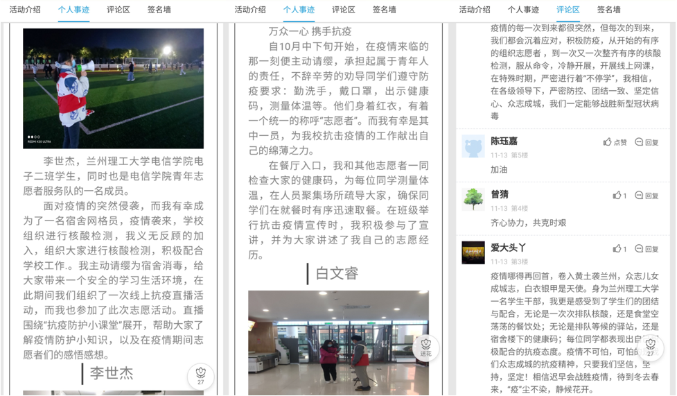 活动期间同学们纷纷在评论区、签名墙上留下自己的感受。20级学生王继组说到:“疫情的每一次到来都很突然,但每次的到来,我们都会沉着应对,积极防疫,感谢你们无私的奉献者,安全的守护人。让我们为奋斗在疫情一线的人致敬”