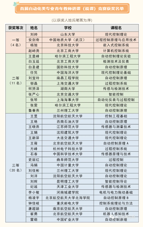 本次大赛由教育部高等学校自动化类专业教学指导委员会主办,南京理工大学承办,本着推动高等学校自动化类任课教师专业发展和教学能力提升为目标,着力培养高素质、专业化教师队伍,促进一流课程建设。大赛分为初赛和复赛两个阶段,其中初赛采用网上申报、线上评审的方式,成绩由课堂教学(讲课录像1学时)、教学设计(教案)和教学创新三部分组成;考虑疫情影响原定线下复赛采用线上线下融合方式,成绩由初赛、说课和答辩三部分组成。大赛共有86所学校、116位老师提交参赛资料,首先经过课组内容界定及讲课录像时长审查,确定88位教师参加初赛;然后通过教指委委员和协作委员共54人、分5组对88位参赛教师进行线上初评,评审出各组平均分排在前列的35位教师(分别来自30所高校)进入复赛;最后采用线上说课及专家提问方式确定获奖名次。