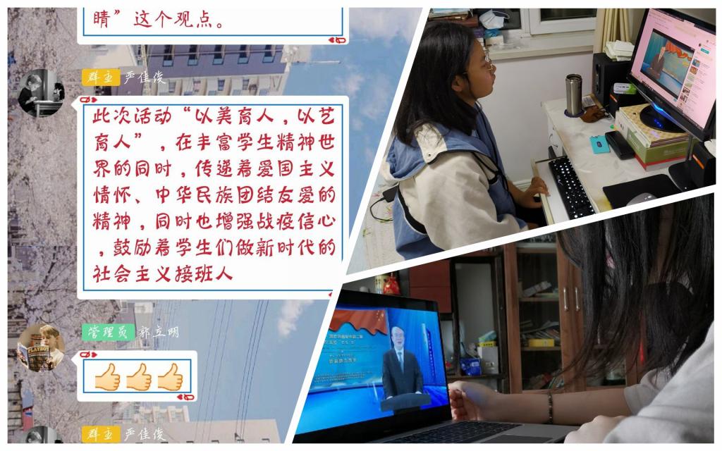 活动中,各班学生利用群课堂等载体在线观看了“美育云端课堂”展演,用心感受,用心聆听,深刻体悟到了艺术的魅力与祖国的强大。展演通过网上演唱演出、名家讲堂、音乐课堂等系列艺术形式,展示了中国的民族精神,用爱心谱写了英雄的赞歌,为青年学生组织了一次别开生面的艺术教育。