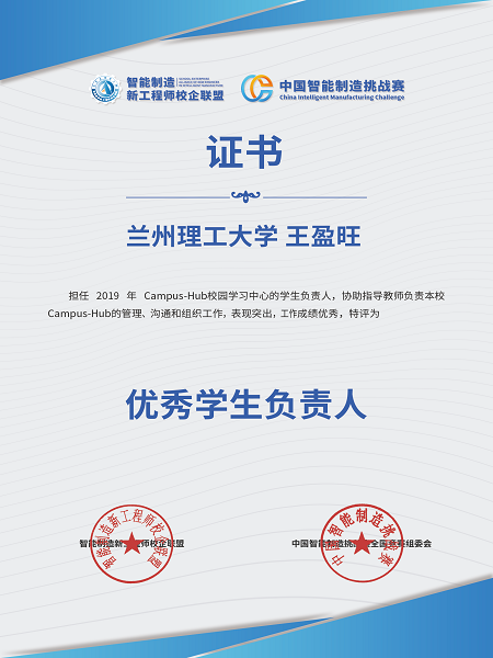 近日我校Campus-Hub校园学习中心(以下简称学习中心)获得智能制造新工程师校企联盟和中国智能制造挑战赛组委会(以下简称组委会)联合颁发的2019年优秀工作单位称号,学习中心负责人王盈旺同学获优秀学生负责人称号,以奖励学习中心在过去一年建设过程中的优异表现。