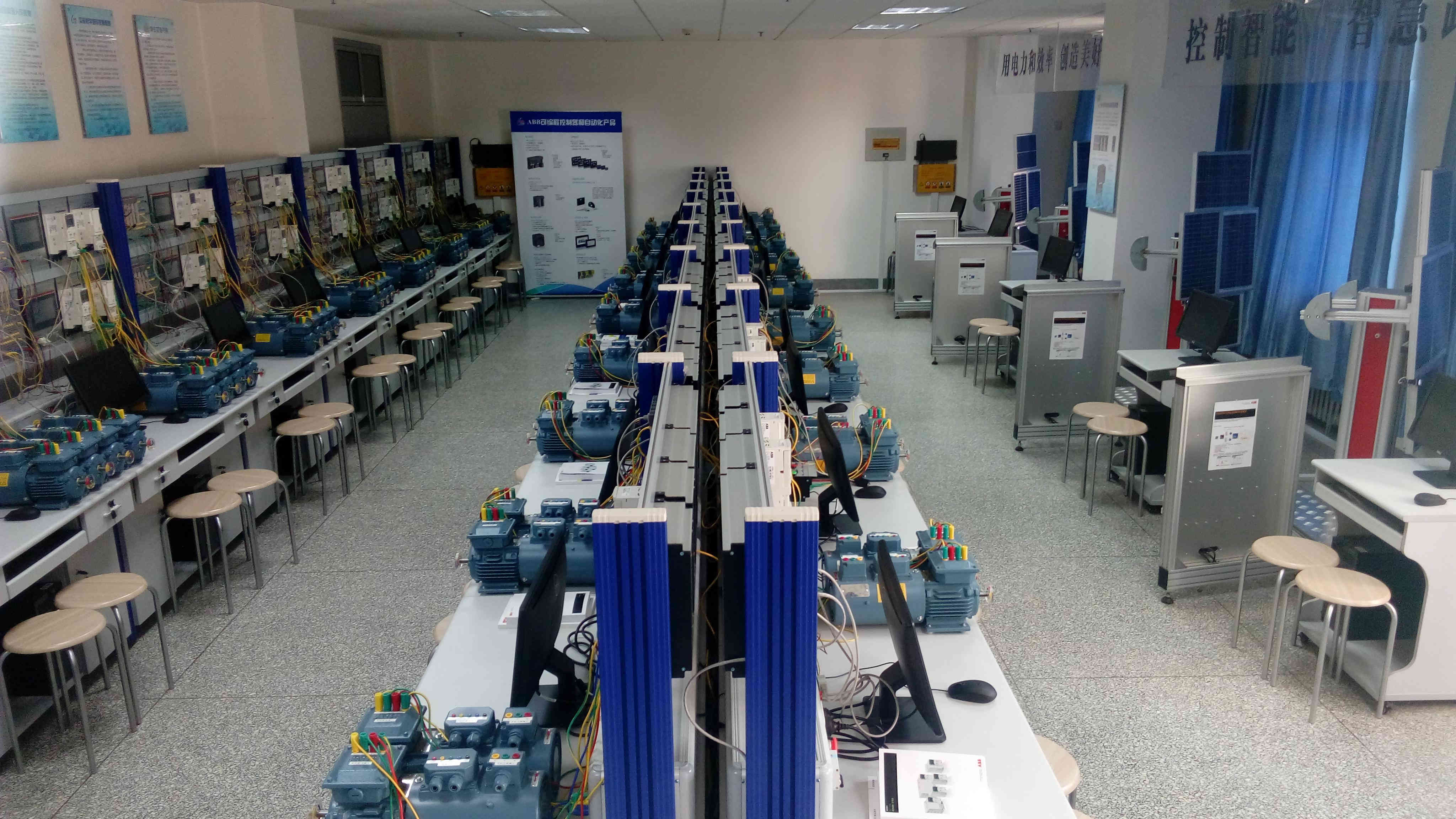-ABB自动化实验室总投资达350多万元,实验室占地面积100平方米,可同时容纳40名师生同时进行教学和科研实验。实验室整体系统采用ABB公司最新的AC500 系列可编程控制系统、ACS355微型传动、ABB高效节能变频低压电机、NextMove e100三轴伺服控制器等部件,控制器之间通过工业实时以太网构建系统网络,总线演示台同时支持CS31 Bus、Modbus TCP、PROFIBUS等多种典型现场总线工作模式。变频控制支持就地编程器操作、端子控制及现场总线三种典型的工程现场操作模式。变频电机自带编码器与控制器高速计数通道配合,可以完成基于位置和速度的双闭环调控。三轴伺服控制器装置可以支持伺服电机的转矩模式控制、伺服电机的位置模式控制、2轴伺服电机同步控制、3轴伺服电机同步控制等研究实验。五个太阳能双闭环轨迹跟踪系统装置则参照工程实物模型制作,基于该模型可以进行太阳能发电过程中的相关控制算法研究,涉及工业网络技术基础及应用、现场总线技术、工业网络系统及应用、工业自动化技术、计算机控制技术应用等专业领域。同时,实验室在建设过程中根据无码影片