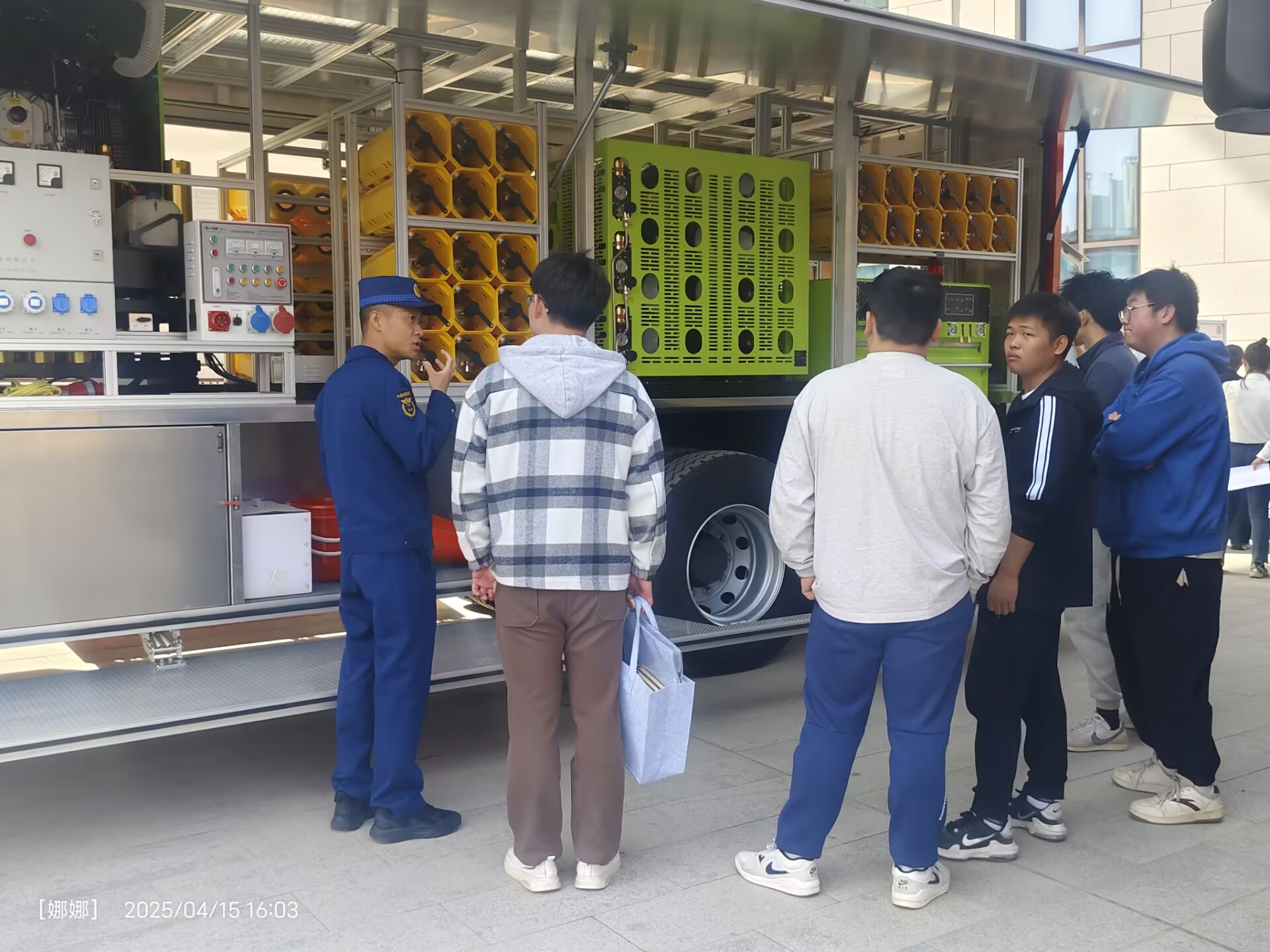 组织师生代表在彭家坪校区图书馆东广场参加消防演练。消防支队教官现场示范灭火器“提、拔、握、压”操作要领,指导学生分组培训,确保人人掌握初期火灾扑救技能。穿插消防知识问答环节,围绕“电动车电池上楼危害”“宿舍禁用大功率电器”等主题互动,深化安全认知。