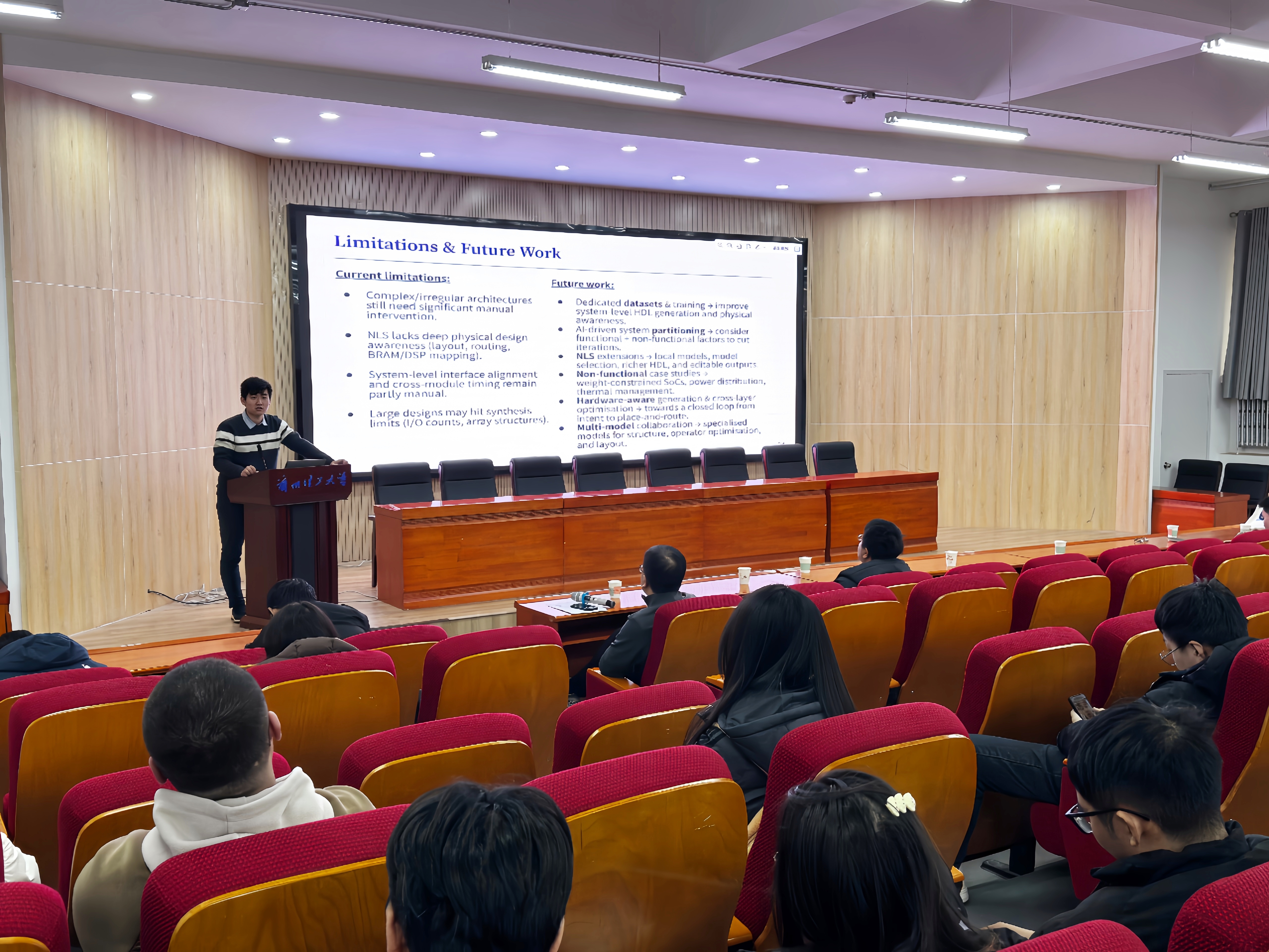 中山大学博士研究生陈捷龙作题为《面向时变优化的低负载零化神经网络研究》的报告,分享了在机器人控制等领域,通过精简矩阵求逆操作实现算法轻量化与性能优化的新思路。谢菲尔德大学博士杨凯元以《NLS:利用生成式AI的自然语言综合》为题,介绍了其团队自主研发的“自然级综合”工具在生成式AI与EDA交叉研究中的应用成果。