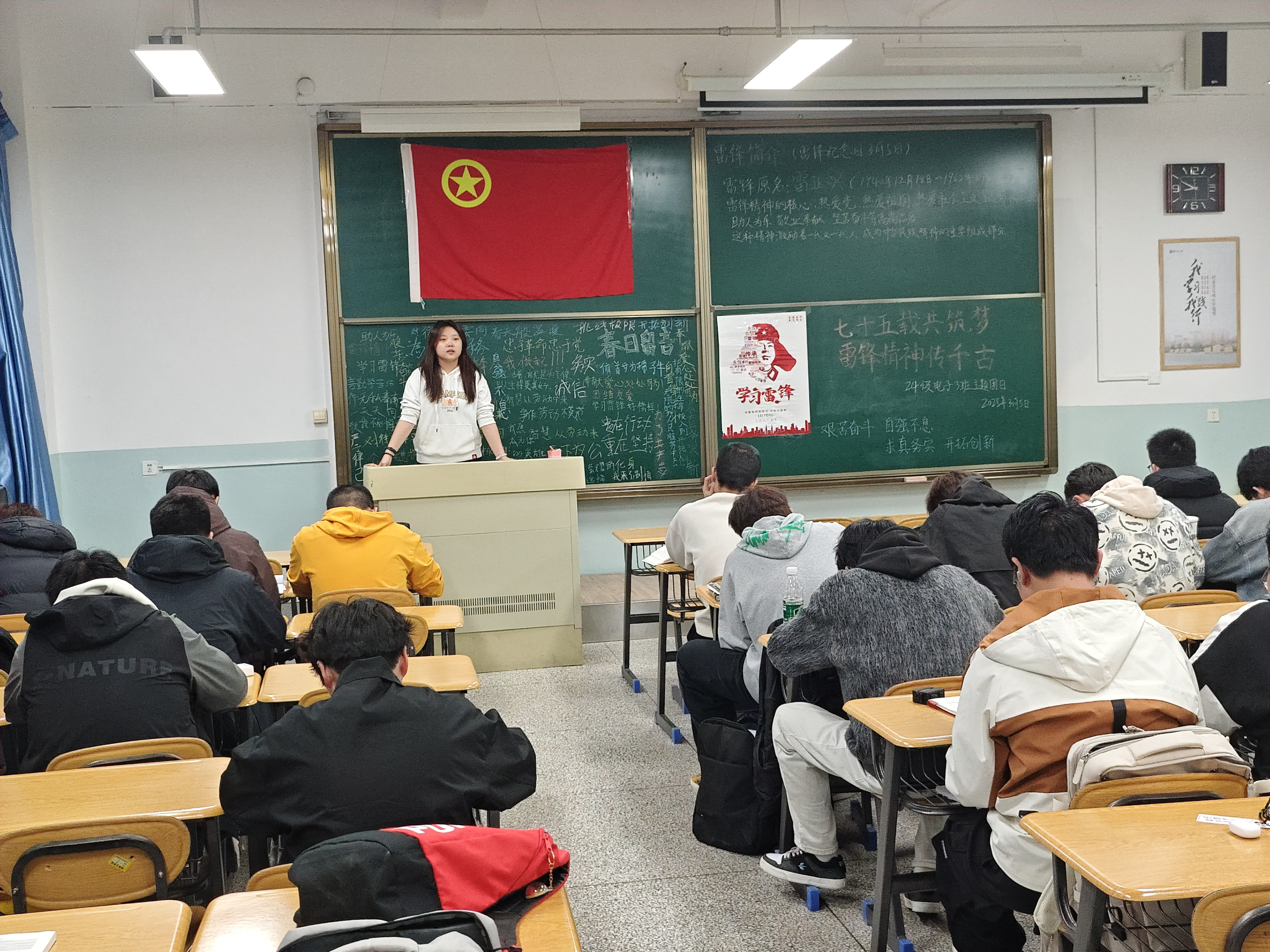 各团支部开展“讲好雷锋故事,传承雷锋精神”主题团课。在电子3班团支部,辅导员朱毅林为大家分享雷锋故事,从雷锋同志的生平事迹、雷锋精神的内涵、学习雷锋精神的意义以及经典雷锋语录这四个方面,向同学们展现了雷锋同志平凡而伟大的一生。团员青年表示将学习雷锋精神、践行雷锋品质,让雷锋精神在新时代持续闪耀光芒。