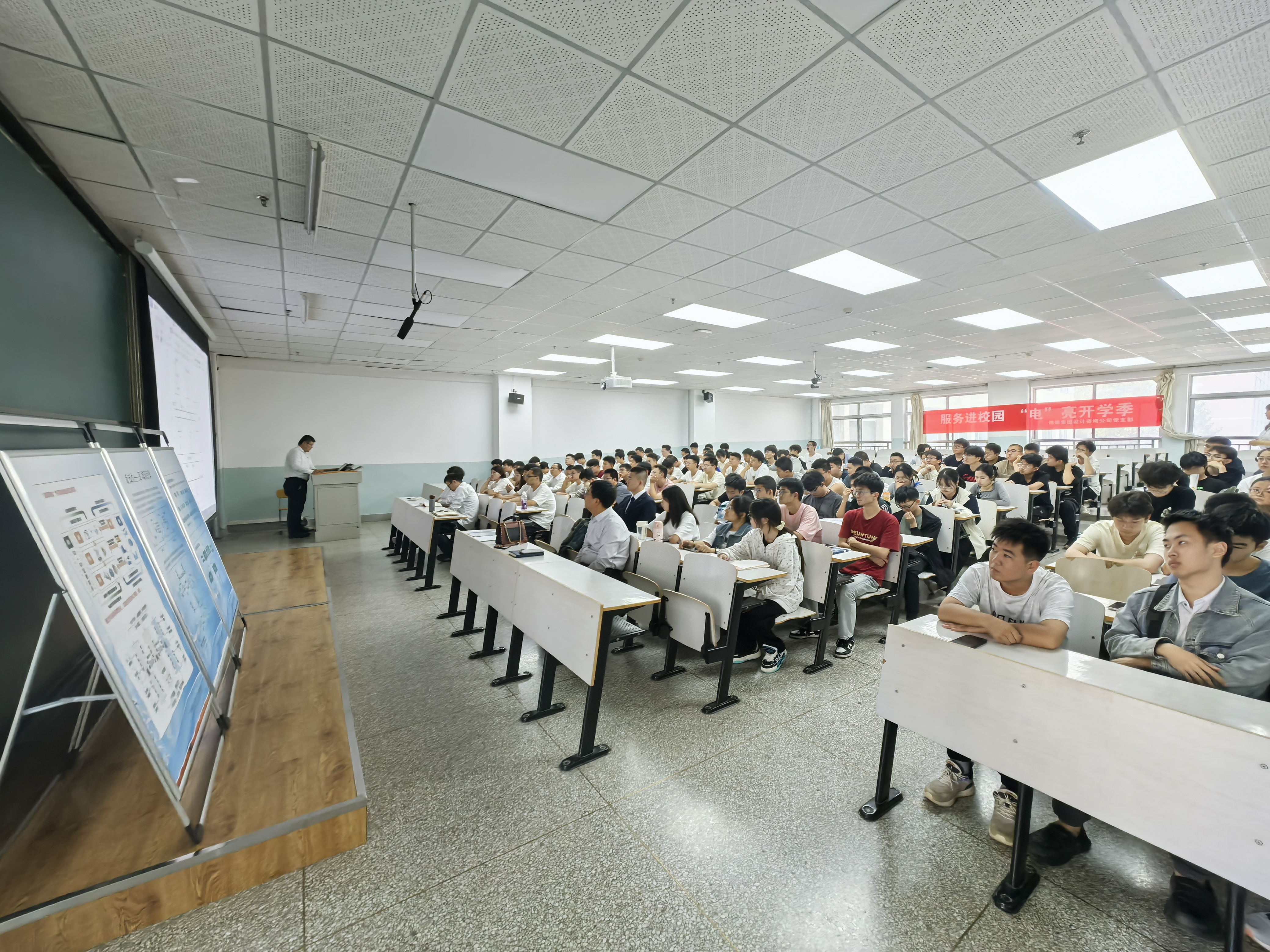 本次“党建联建”活动分为两个阶段。第一阶段,由倚能设计咨询公司党支部书记彭焕昕高工作了题为《新型电力系统电气基础知识》与《新型电力系统“源网荷储”协同发展》的报告,接着系统新能源室副主任高级工程师薛莲和配网电气主设高级工程师火熠分别作了题为《数智化设备在电网中应用》、《电动汽车充电站相关知识》的专题讲座,张宏亮副院长最后进行了总结发言。电气工程及其自动化专业2021级、2024级全体同学现场聆听了系列报告,第一阶段活动由电气工程系副主任裴婷婷主持。