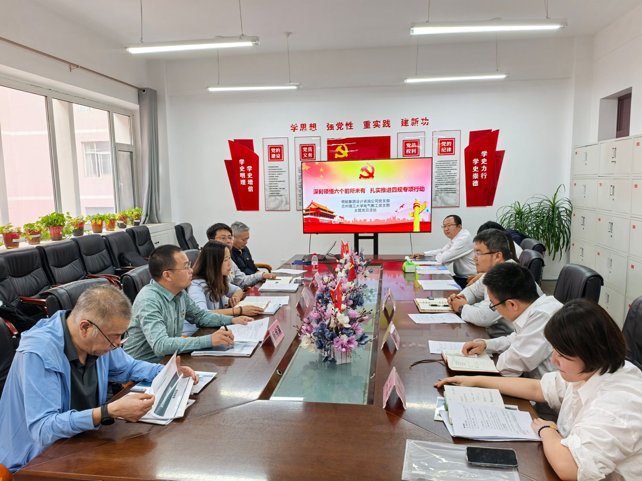 副院长张宏亮、电气教工党支部书记杨维满及支委委员、教工党员代表,倚能设计咨询公司薛莲、火熠高工及公司党支部先进党员、优秀青年员工代表。