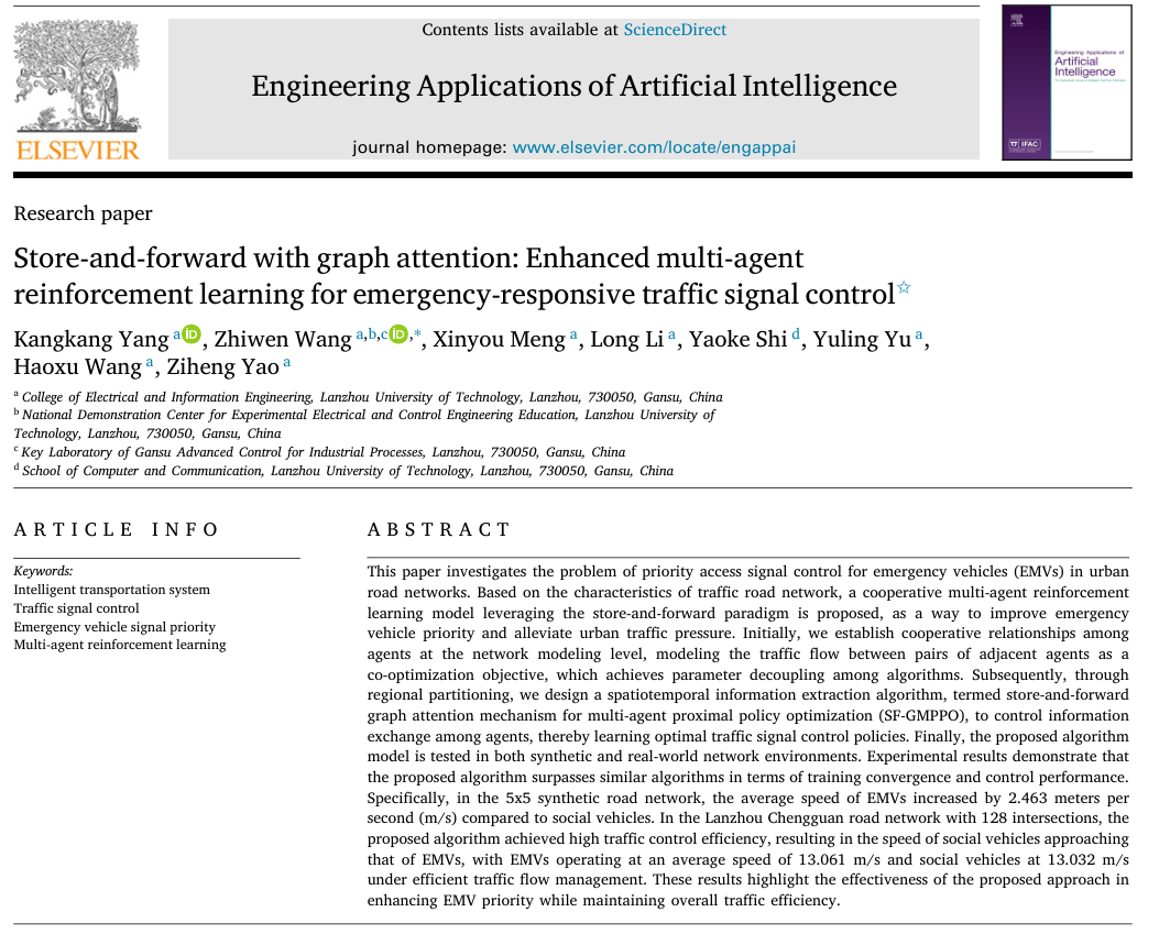王志文教授团队在城市交通信号控制领域取得重大突破,由博士生杨康康为第一作者的研究论文《Store-and-forward with graph attention:Enhanced multi-agent reinforcement learning for emergency-responsive traffic signal control》在线发表于人工智能顶级期刊《Engineering Applications of Artificial Intelligence》(中国科无码影片
