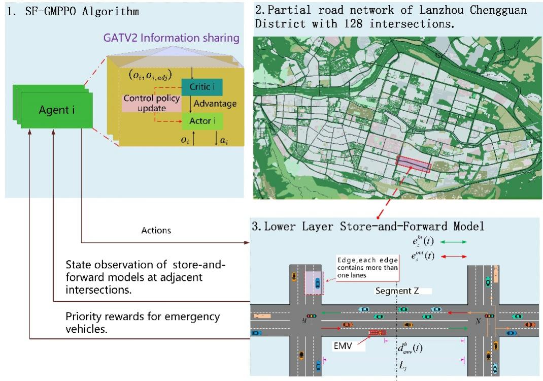 研究针对城市交通信号协同控制难题,提出了一种创新的“图注意力存储转发”强化学习范式。为支撑该研究,团队自主研发了超算级交通仿真平台T-X,并设计了可伸缩的宏观-微观协同控制架构。通过在兰州市城关区复杂路网的仿真测试,该方法首次实现了跨尺度交通信号的协同优化,验证了其在提升城市交通效率与应急响应能力方面的巨大潜力,为智慧交通发展探索了新方向。